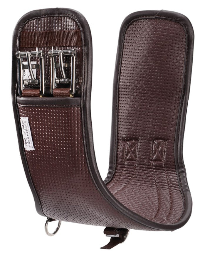 The Equi-Prene Pressure Eze Dressage Girth is an innovative equestrian accessory designed to enhance horse comfort and performance. This girth features a unique design that reduces pressure on the ascending pectoral muscles, promoting better breathing and preventing potential injuries. By doubling the surface area over critical muscle regions, it effectively halves the pressure exerted during riding. The girth's dual elastic ends further contribute to pressure relief and allow for natural rib expansion, facilitating improved respiratory function.