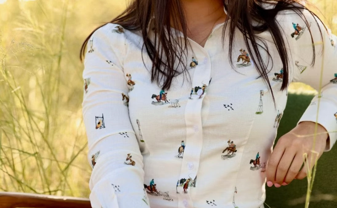 Unveil the elegance of the Aussie Icon Ladies Long Sleeve Linen Blouse, exclusively at Gringa Denim. Crafted from high-quality linen, this blouse features a stunning custom designed graphic print that captures the essence of the Australian Outback. Tailored with meticulous attention to detail, this blouse seamlessly blends Australian heritage with contemporary flair. Explore iconic fashion with a touch of the outback.