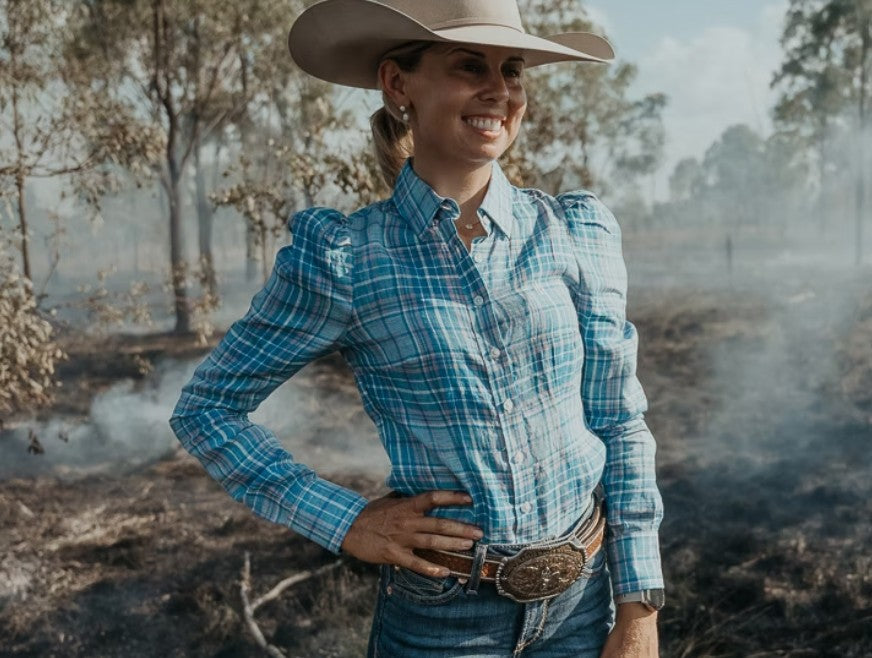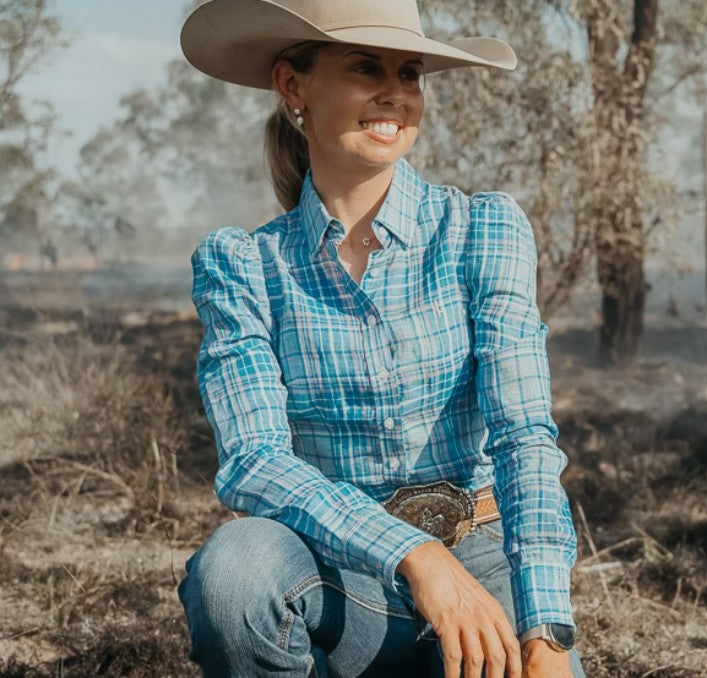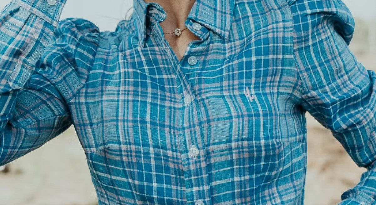 The Bluebell Shirt brings a fresh pop of colour to your wardrobe with its vibrant sky-blue check woven through with soft musk-pink accents. The subtly structured puff sleeves add a feminine touch, while the breathable linen keeps you cool and comfortable all day long.