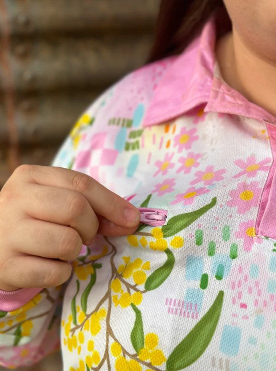 The Posey Fishing Shirt is here ! Featuring a colourful wattle print inspired by the country lifestyle. These shirts are an all rounder shirt that you can wear in the paddock, on a horse, in the garden, swimming, around the house and everything in between.