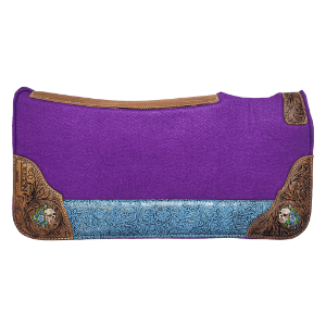 Make a bold statement with this hand tooled and painted skull felt pad. Made from synthetic felt, this pad features a wither cut-out relief, turquoise floral wear leathers and a hand-tooled floral skull design on the leather corners and wither. The hand-painted silver skull is beautifully highlighted with bright, vibrant flowers, adding a unique and artistic touch to your saddle pad collection.