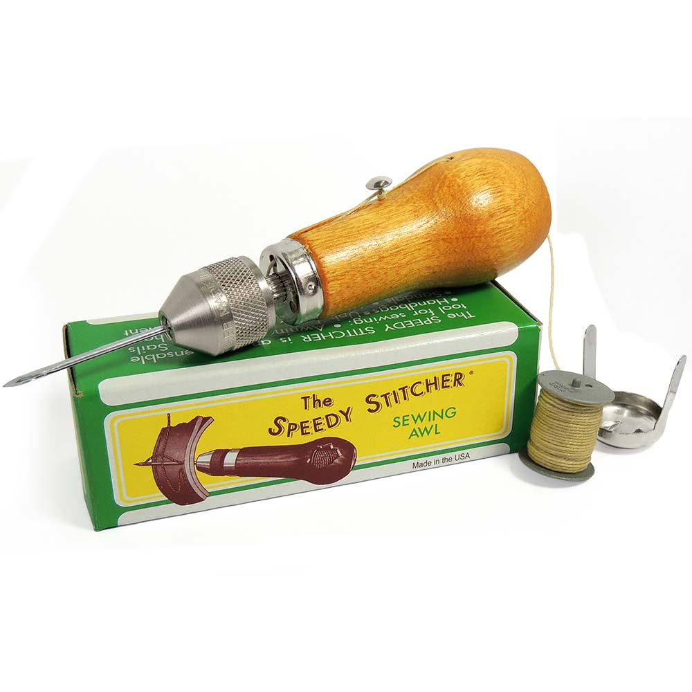 The Speedy Stitcher is a sewing awl, handy for hand-sewing heavy materials including leather, canvas or vinyl.  Designed to sew a lock-stitch, just like a sewing machine.  Made in the USA.